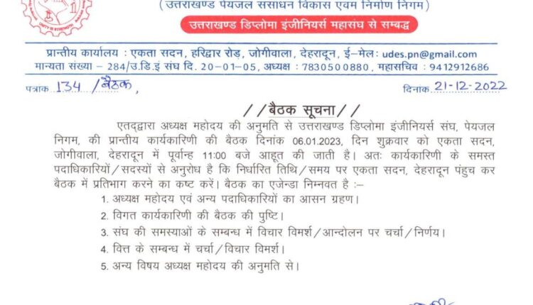 देहरादून। पेयजल निगम डिप्लोमा इंजीनियर्स संघ के महासचिव अजय बेलवाल ने प्रेस विज्ञप्ति के माध्यम से बताया कि संगठन की विभिन्न लम्बित मांगों को लेकर 06 जनवरी 2023 संगठन की बैठक की जायेगी।