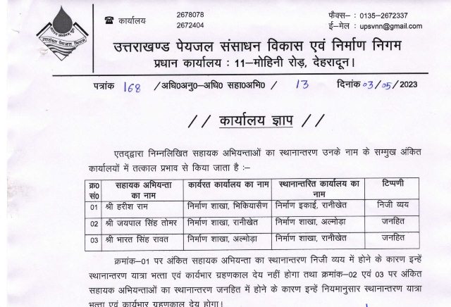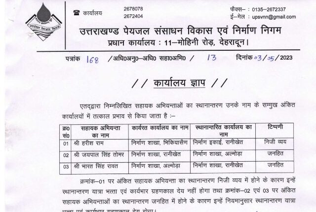 देहरादून। उत्तराखण्ड डिप्लोमा इंजीनियर्स संघ, पेयजल निगम के महासचिव अजय बैलवाल व अध्यक्ष रामकुमार ने प्रेस विज्ञप्ति के माध्यम से बताया कि उत्तराखंड पेयजल निगम प्रबंधन द्वारा सहायक अभियंताओं के स्थानांतरण आदेश निर्गत किए गए हैं, जो अत्यन्त अल्पअवधि में नियमों के विपरीत जारी किए गए हैं।