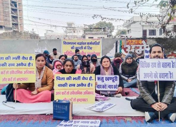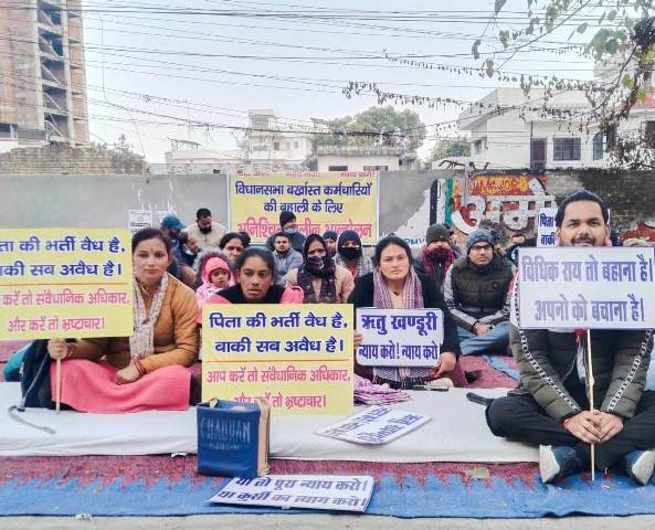 देहरादून 16 जनवरी| उत्तराखंड विधानसभा से बर्खास्त कार्मिक ने 29 वें दिन जारी अपने धरना प्रदर्शन के दौरान विधानसभा सचिवालय पर समय-समय पर कोर्ट के आदेशों की अवहेलना का आरोप लगाया| [प्रदर्शन के दौरान बर्खास्त कार्मिकों ने हाथ में नारे लिखे पोस्टर  थे जिनमे  “पिता की भर्ती वैध है बाकी सब अवैध है, आप करें तो संवैधानिक अधिकार, अन्य करे तो भ्रष्टाचार” जैसे नारे लिखे थे।