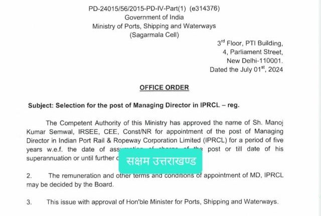 नई दिल्ली। उत्तराखण्ड सरकार के उपक्रम ब्रिडकुल मे एमडी पद पर अपनी सेवाएं देने वाले योग्य इंजीनियर मनोज कुमार सेमवाल को भारत सरकार ने भारतीय पोर्ट रेल और रोपवे कॉर्पोरेशन लिमिटेड (आईएफआरसीएल) में पांच साल की अवधि के लिए प्रबंध निदेशक के पद पर नियुक्त कर दिया है । सेमवाल को पांच साल की लिए एमडी बनाया गया है जिसमे उसकी सेवानिवृत्ति की तिथि तक या अगले आदेश तक जो भी पहले हो उसके लिए नियुक्ति दी गयी है।