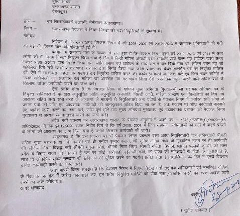 उनियाल ने कहा कि जांचो को लंबित करने से प्रतीत होता है कि पेयजल निगम के मुख्य अभियंता (मुख्यालय) जो सहायक अभियंता पद के नियुक्त प्राधिकारी हैं के द्वारा अवैध नियुक्त हासिल करने वालों को बचाने का प्रयास कर रहे है , इसलिए गलत तरीके से आरक्षित पदों पर नियुक्त व्यक्तियों पर उचित कार्यवाही करने तक तक मुख्य अभियंता मुख्यालय एवं अन्य संबंधित अधिकारी को पेयजल निगम मुख्यालय से अन्यत्र स्थानान्तरण किया जाना न्यायहित में अति आवश्यक है ।
