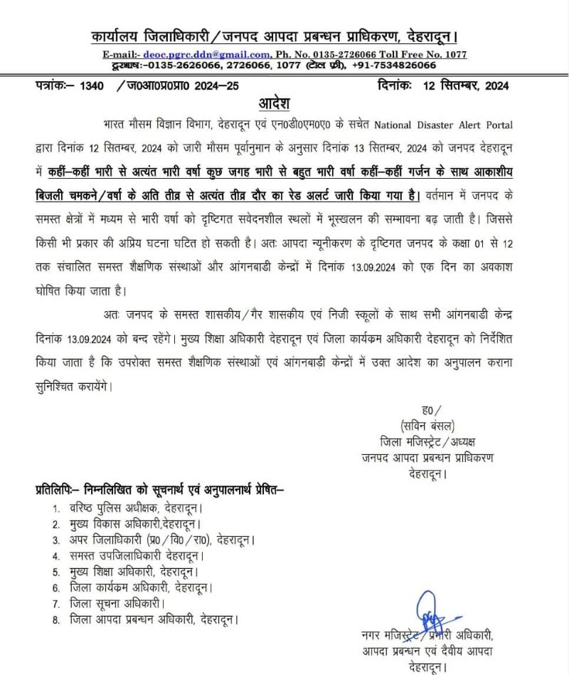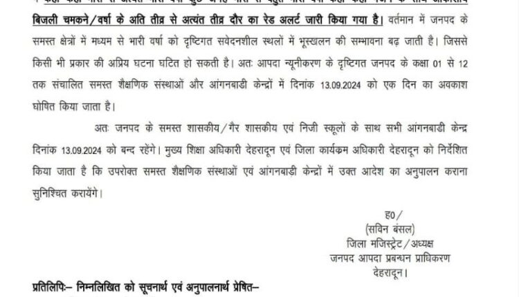 देहरादून। उत्तराखंड में लगातार बारिश के कारन प्रदेश के स्कूलों में अवकाश घोषित कर दिया गया है। मौसम विज्ञान विभाग की ओर से जारी पूर्वानुमान के अनुसार 13 सितंबर को भारी से भारी बारिश की चेतावनी के चलते प्रदेश के सभी जिलों में शुक्रवार को स्कूल बंद रखने का फैसला लिया गया है। जिला प्रशासनों ने बच्चों की सुरक्षा के मद्देनजर 12वीं तक के सभी तरह के स्कूल बंद रखने का आदेश जारी कर दिया है।