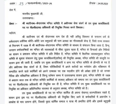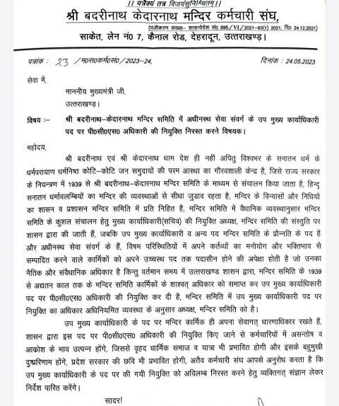 श्री बद्रीनाथ केदारनाथ मंदिर कर्मचारी संघ ने नियुक्ति निरस्त करने के लिए सीएम को भेजा खत